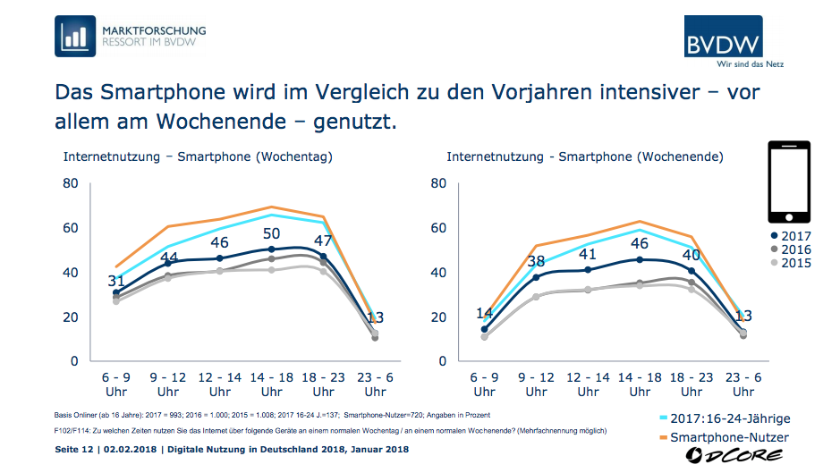 Die Nutzung der mobilen Endgeräte bleibt Wochentags gleich, während der Nutzeranteil am Wochenende angestiegen ist. Es zeigt sich eine intensivere Nutzung von Smartphones: Es wird länger und auch häufiger am Tag herangezogen als in den Vorjahren.