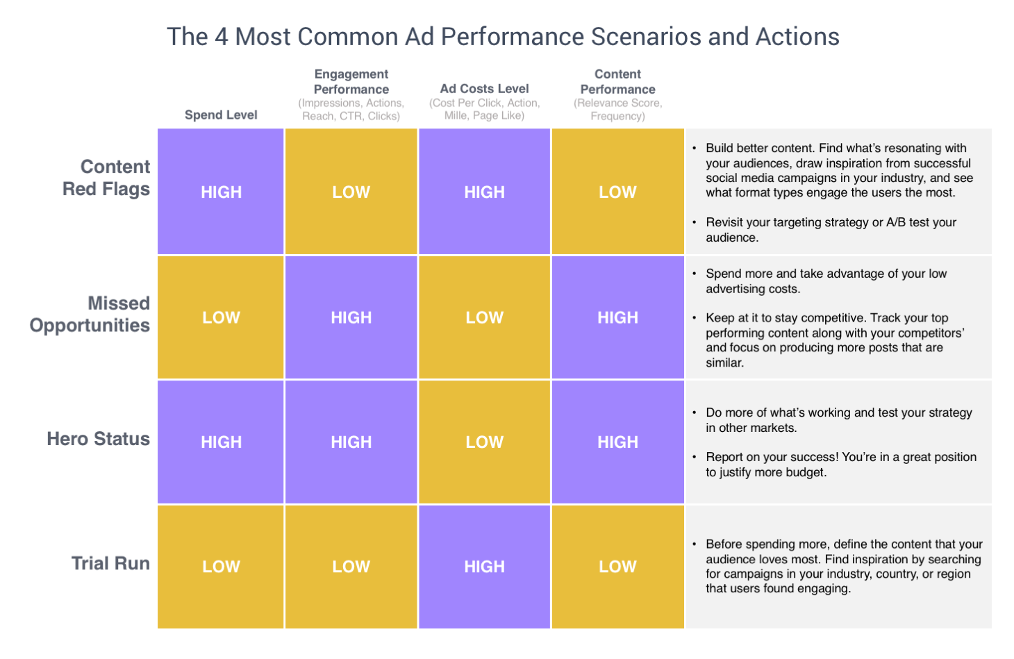 Sind hingegen die Werbeausgaben für Social Ads gering, die Performanceleistung aber hoch und das Werbevolumen höher als bei den Wettbewerbern, werden Marketer auch einen hohen ROI erreichen. Nimmt ein Marketer in diesem Szenario dann noch mehr Geld für Social Media Werbung in die Hand und optimiert seinen Gross Rating Point in Social Media, erlangt er einen Wettbewerbsvorteil. Die Alarmglocken sollten bei Marketern allerdings läuten, wenn sowohl das Kostenniveau als auch die Ausgaben deutlich höher als beim Wettbewerb sind. Marketer sollten dann mehr Zeit darauf verwenden, ihre Zielgruppe besser zu verstehen, bessere Segmente zu erstellen und relevanteren Content zu verbreiten.