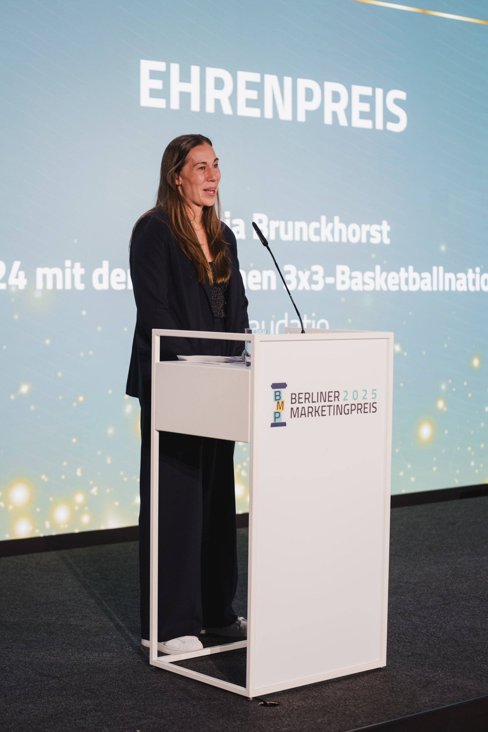 Der emotionale Höhepunkt des Abends: der Ehrenpreis für das Gründerinnen-Team des FC Viktoria Berlin Frauen. Die Olympiasiegerin im 3×3 Basketball Svenja Brunckhorst hielt die Laudatio – persönlich, sportlich, mit spürbarem Respekt: „Diese Frauen haben nicht nur ein Team gegründet, sondern eine Marke mit Haltung – für Gleichstellung, Innovation und Wandel.“