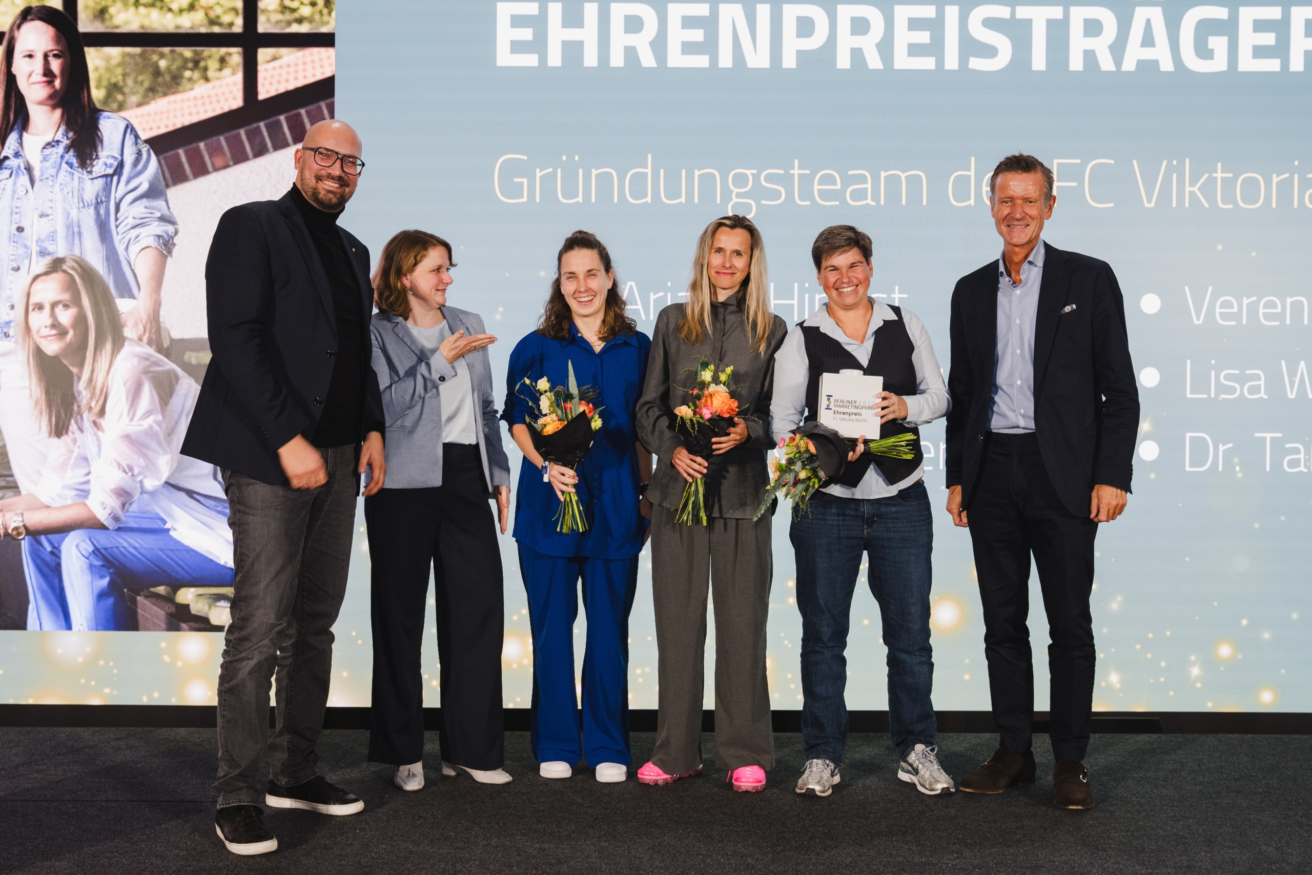 - Der Ehrenpreis geht an das Gründerinnenteam des FC Viktoria Berlin Frauen. Gewürdigt werden unternehmerische Weitsicht, professionelle Markenführung und gesellschaftliches Engagement für Gleichstellung im Sport.