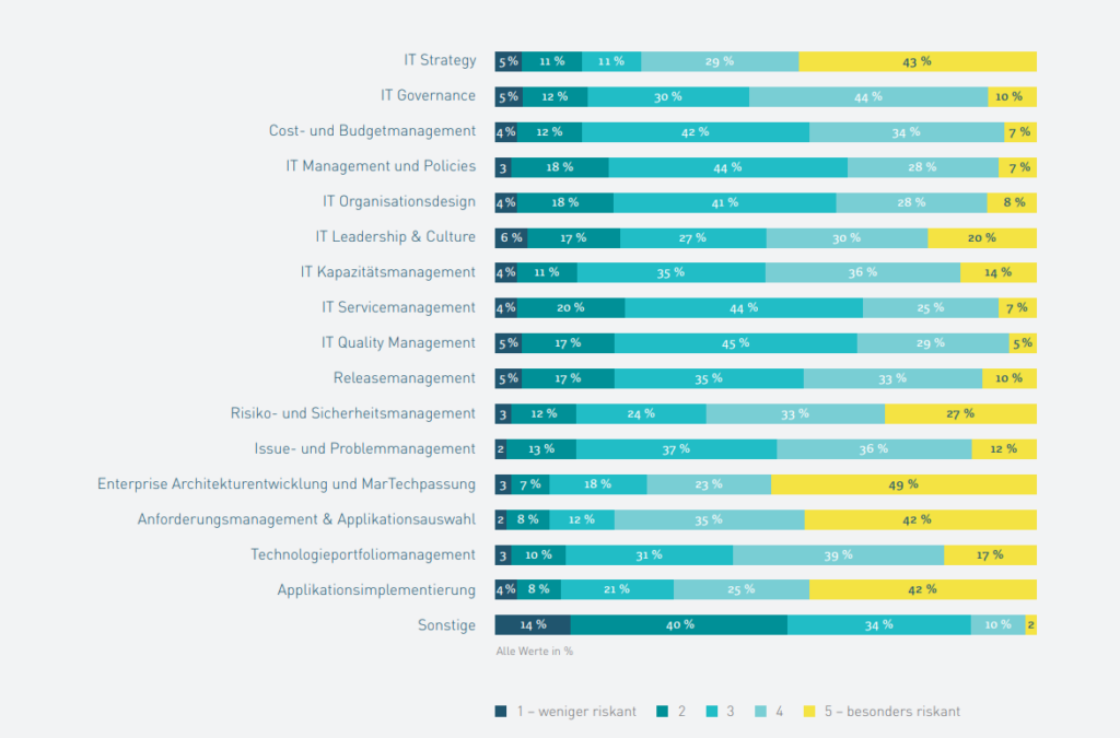 Auch die Zusammenarbeit mit der IT bleibt eine Herausforderung für Marketingorganisationen. Besonders für die Bereiche IT-Strategie, IT Governance und das Kosten- und Budgetmanagement wird sie von den befragten Entscheidern als wichtig erachtet. Ist die Zusammenarbeit dieser Abteilungen unzureichend, ergeben sich er Studie zufolge Risiken für die IT-Strategie, in Architekturfragen oder auch für die Implementierung der Anwendungen.