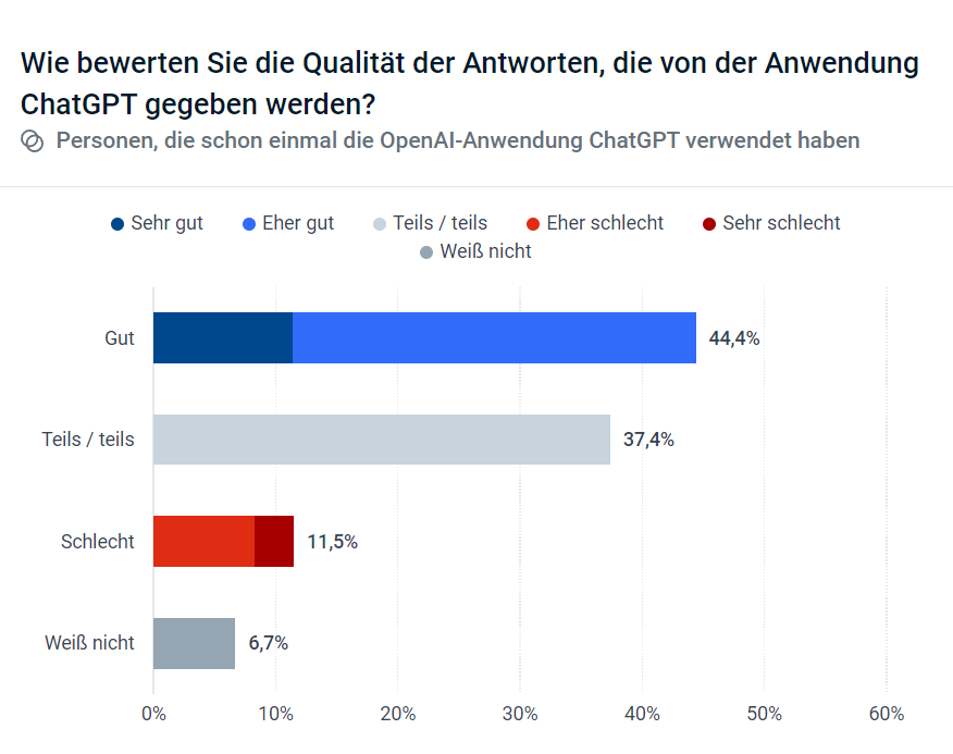 44 Prozent der befragten Personen schätzen die Qualität der Antworten als gut oder sehr gut ein. Elf Prozent bewerten sie eher schlecht oder sogar sehr schlecht. „Die Qualität der Antworten hat jedoch noch nichts mit der Richtigkeit der Inhalte zu tun“, sagt Tobias Kollmann, Inhaber des Lehrstuhls für Digital Business und Digital Entrepreneurship an der Universität Duisburg-Essen.