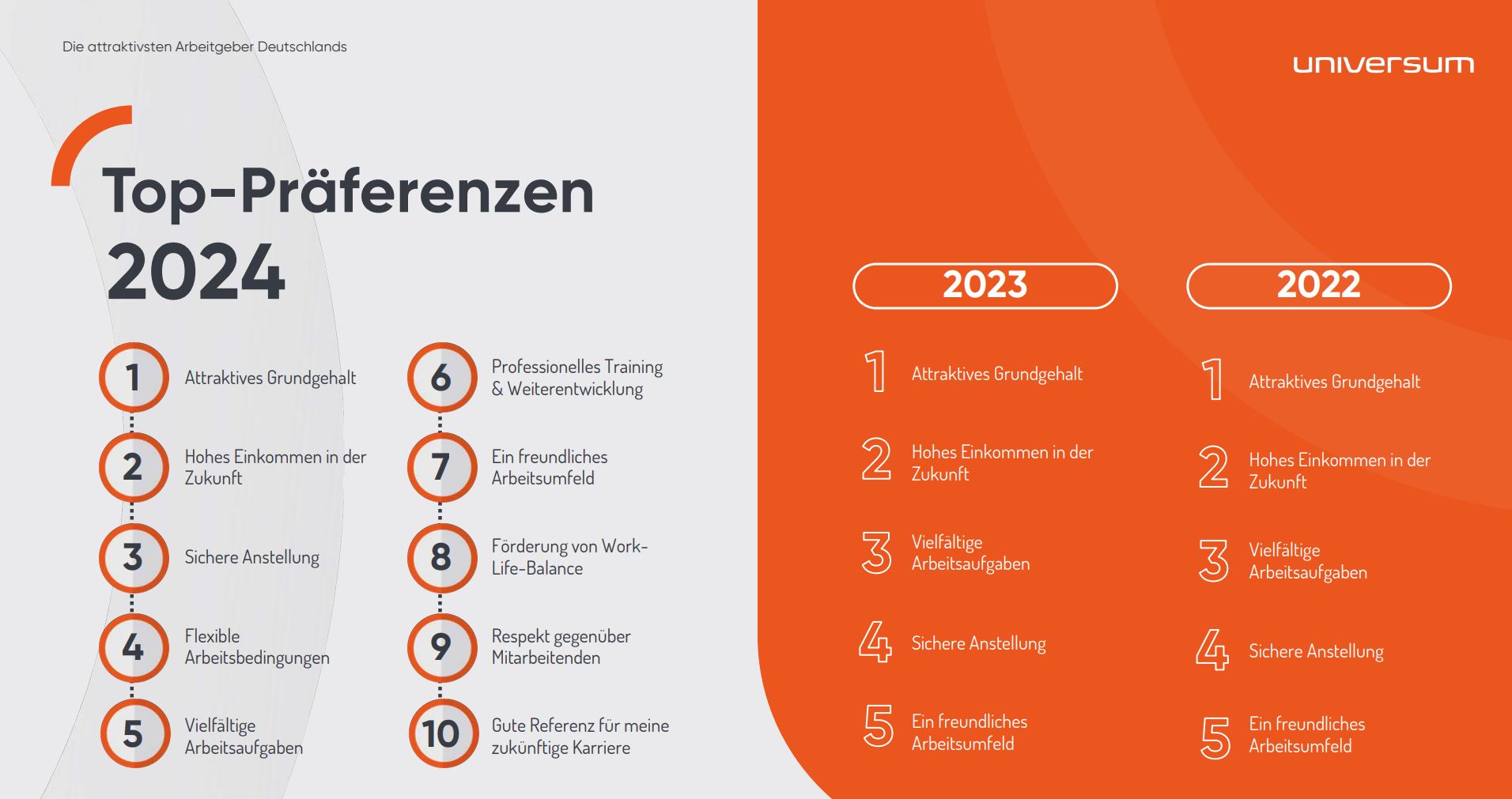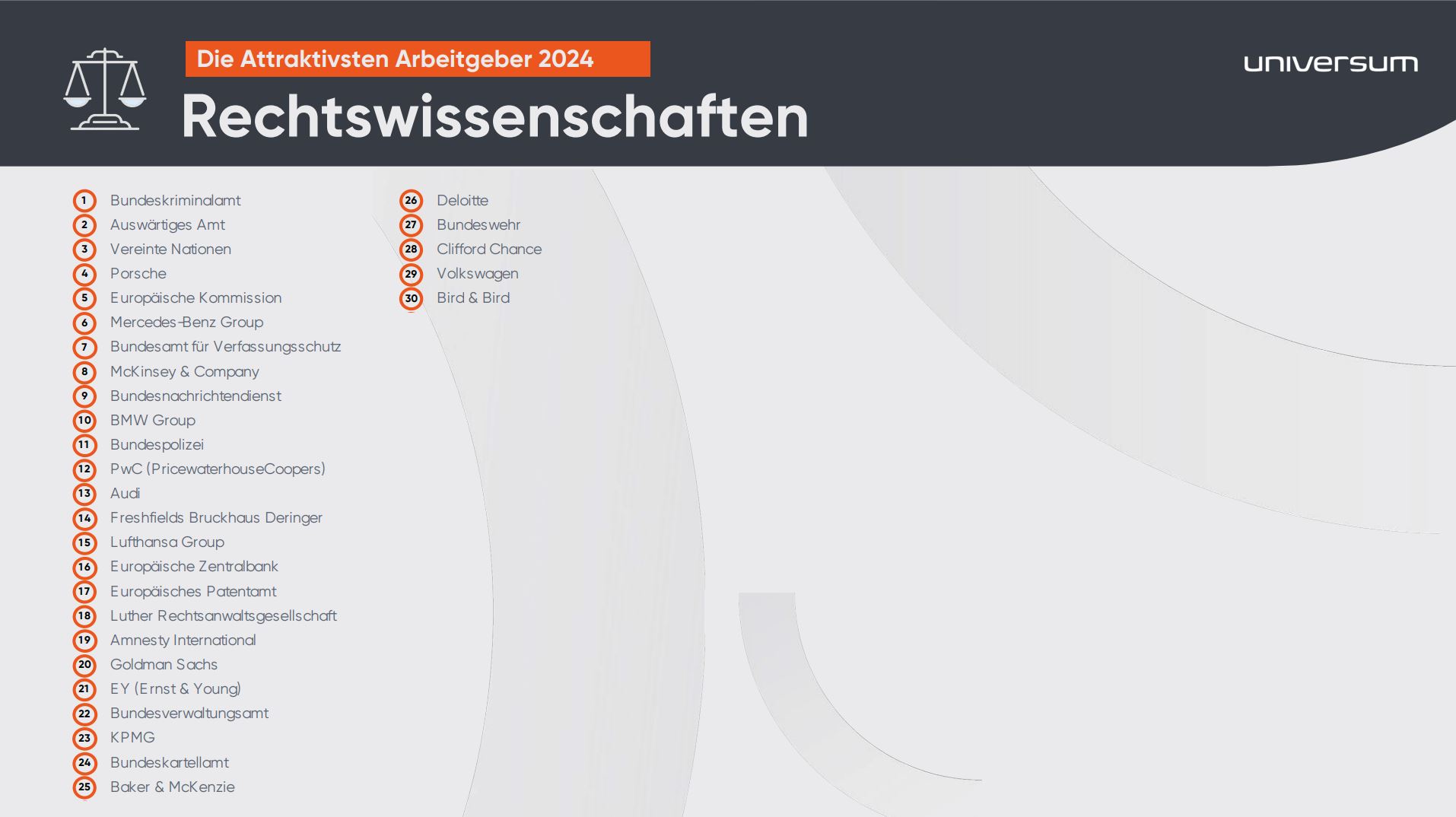 Für den Universum Student Survey 2024 wurden zwischen September 2023 und April 2024 insgesamt 30.575 Studierende an 236 Hochschulen in Deutschland befragt. Auf dieser Basis erstellte Universum die Arbeitgeberrankings für die verschiedenen Studienrichtungen. Universum, Teil der The Stepstone Group, ist ein weltweit im Bereich Employer Branding agierendes Unternehmen. Nach eigenen Angaben ist Universum in 60 Märkten aktiv und hat Standorten in 14 Ländern.