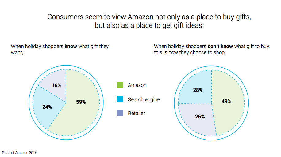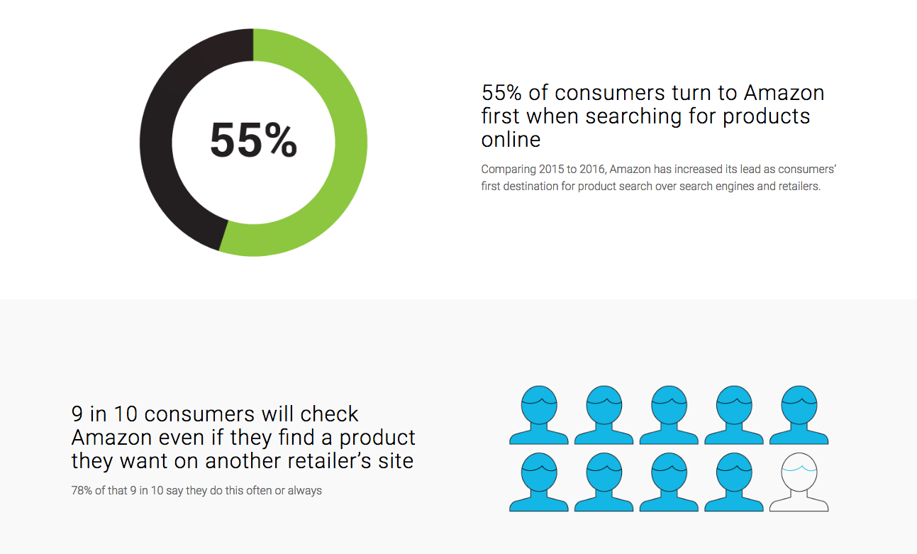 Neun von zehn Amerikanern gehen auch dann auf die Seite des Online-Giganten, wenn sie ihr Produkt bereits bei einem anderen Online-Shop gefunden haben – häufig zum Angebots- und Preisvergleich. Und die Chance, dass ein amerikanischer Amazon-Prime-Nutzer bei einem anderen Shop einkauft, wenn er seine Produktsuche bei Amazon startet, liegt gerade einmal bei 0,9 Prozent.