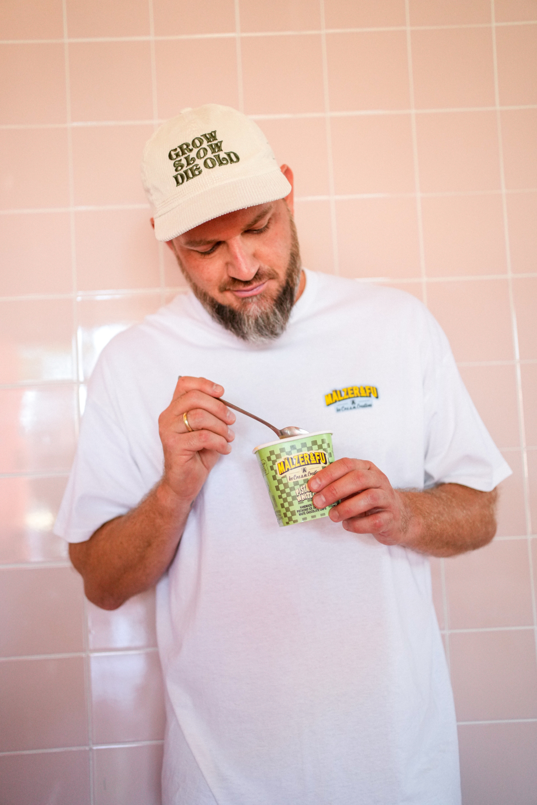 „Eigentlich wöchentlich, wenn ich ehrlich bin“, antwortet Chris auf die Frage, ob es im vergangenen Jahr Momente gab, in denen Tim und er an ihrer Marke gezweifelt hätten. „Tim und ich sind da ähnlich gestrickt.“ Die Nachfrage nach „Mälzer&Fu“ hatte direkt in den ersten Wochen nach dem Launch im Oktober 2023 die Erwartungen der beiden Männer übertroffen, war die Eissaison doch eigentlich schon vorbei. Die Nachbestellungen hätten sich auf einem sehr hohen Niveau eingependelt. Kamen an einem Tag mal weniger Aufträge rein, machten sich beide sofort Sorgen, dass niemand mehr ihr Eis will. „Das ist aber, glaube ich, dem geschuldet, dass wir noch Laien in diesem bestimmten Sektor sind“, sagt Boszczyk. „Aber es ist auch gut, eine gesunde Demut vor dieser Industrie und das Bewusstsein zu haben, sich nicht auf seinem Erfolg ausruhen zu dürfen. Jeder Tag ist eine Lernkurve.“