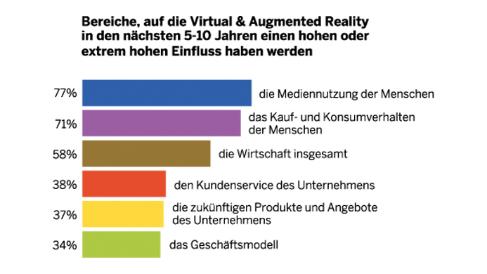 Das Thema entwickelt sich in den Unternehmen zur Chefsache: Ein Drittel erkennt einen grundsätzlichen Einfluss der Technologien auf ihr bestehendes Geschäftsmodell und die Hälfte diskutiert das Thema bereits auf Geschäftsführerebene. Dennoch setzen sich aktuell die meisten Firmen in erster Linie mit der Weiterentwicklung bestehender Angebote auseinander – erst ein Fünftel ergreift die Chance auf Basis von VR & AR neue Geschäftsmodelle zu entwickeln oder neue Erlösquellen zu erschließen.