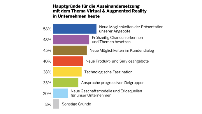 Bislang hat jedoch nur jedes fünfte der befragten Unternehmen praktische Erfahrungen mit VR & AR gesammelt. Über die Hälfte der Befragten gibt an, sich mit den Möglichkeiten der neuen Technologien auseinanderzusetzen bzw. demnächst mit ersten Projekten zu starten. „Ein Hinweis, dass das Thema VR & AR im Marketing 2017 deutlich an Fahrt aufnehmen wird“, erklärt Heim. Bei 78 Prozent sind Marketing und Kommunikation Treiber dieser Initiativen.