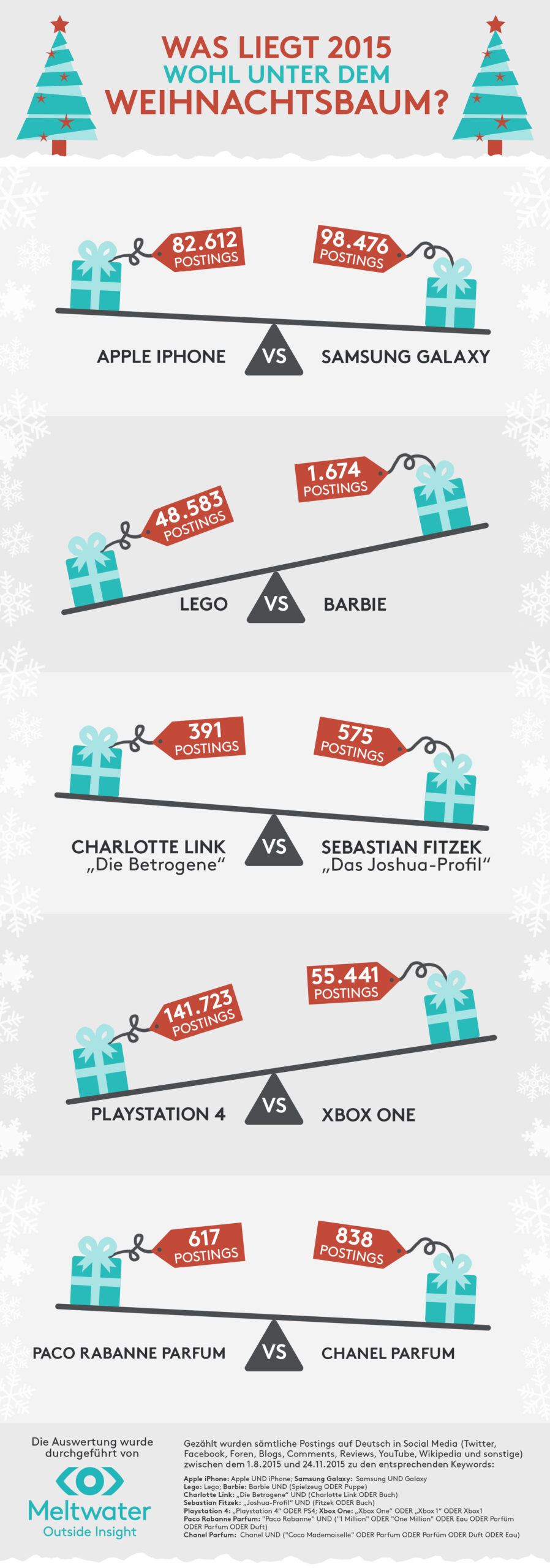 Mit dem Online-Tool Meltwater Buzz wurden Kanäle wie Facebook, Twitter und YouTube, aber auch Blogs, Foren und Kommentare untersucht. Anhand der Stärke des Diskussionsvolumens entstand eine Prognose, welche Marken bzw. Produkte aller Wahrscheinlichkeit nach als Präsent unter den deutschen Weihnachtsbäumen liegen werden.