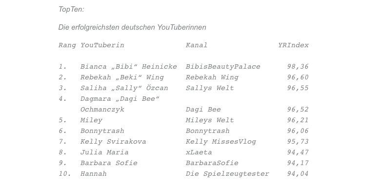 Bianca „Bibi“ Heinicke von „BibisBeautyPalace“ hat es mal wieder auf Platz eins geschafft. Aber noch mehr Frauen und Mädchen begeistern mit Web-Filmen über Schminktipps, Streiche, Spielsachen, Süßigkeiten zum Selbermachen und Spaß im Alltag hunderttausende Fans. Die zehn erfolgreichsten YouTuberinnen hat die Kommunikationsberatung Faktenkontor aktuell mit dem YouTuber-Relevanzindex ermittelt.