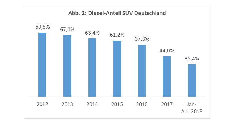 Mit der stürmischen Entwicklung der SUV und der geringen Gegenliebe von SUV-Käufern für Diesel wird der Diesel-Antrieb auch in der Zukunft selbst mit dem „clean Diesel“ nicht auf seine früheren Marktanteile kommen können.