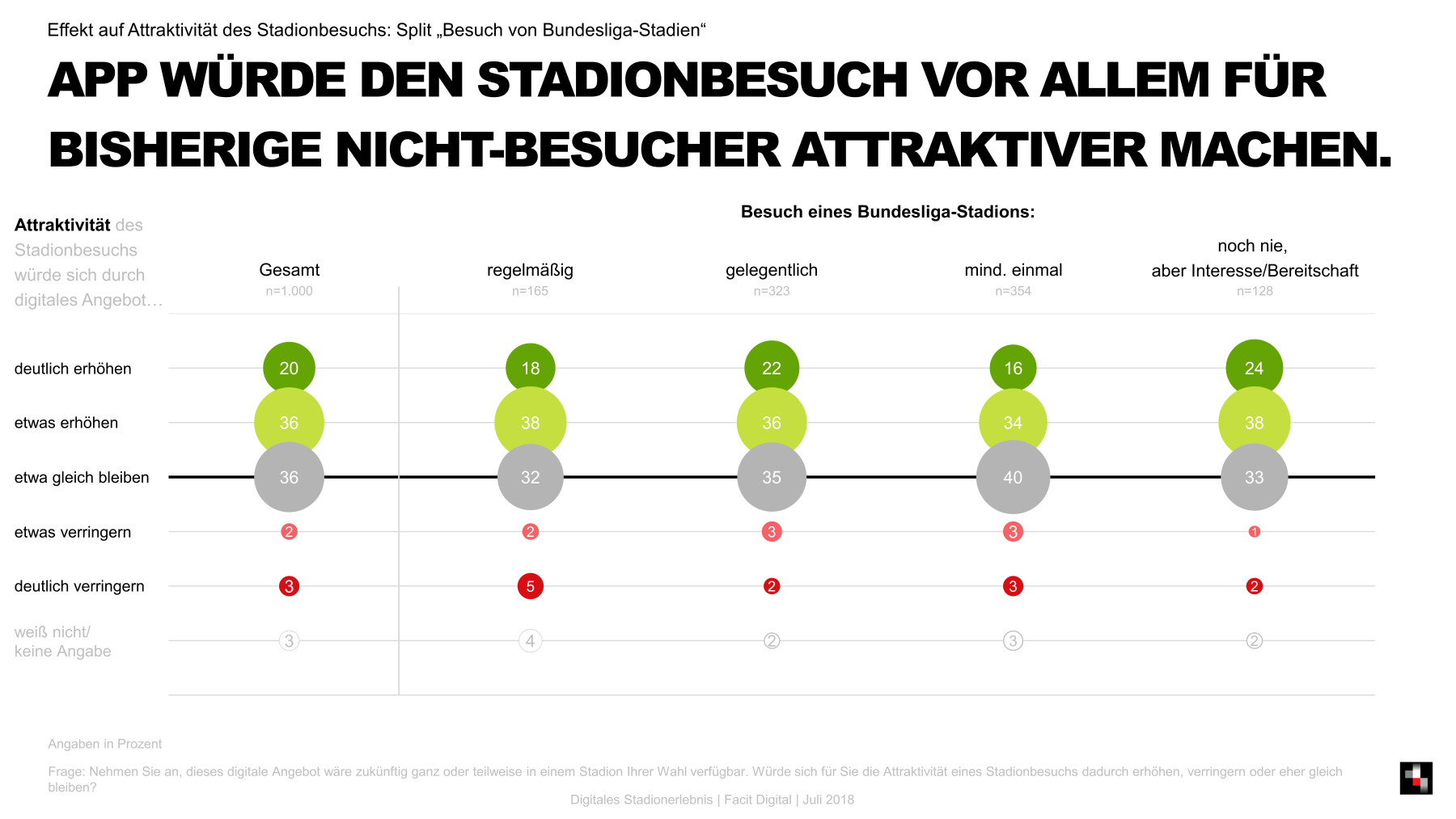 Zur Studie: Im Juli 2018 führte Facit Digital eine Studie zum Thema „Digitales Stadionerlebnis“ im Online Access Panel von respondi unter 1.000 Fußball- und Eishockey-Fans in Deutschland durch. Primäres Ziel der Studie war die Analyse des Bedarfs an digitalen Angeboten und Dienstleistungen rund um den Stadionbesuch aus Fanperspektive. Dabei spielte es zunächst keine Rolle, ob die Fans (zwischen 16 und 59 Jahren) zum Zeitpunkt der Befragung bereits ein Stadion besucht hatten oder nicht. Lediglich die grundsätzliche Bereitschaft zum Stadionbesuch musste gegeben sein. Zudem mussten die Befragten über ein Smartphone verfügen.