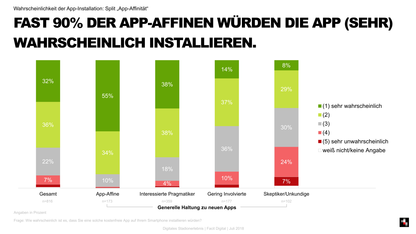Insgesamt 56 Prozent der Befragten sind der Ansicht, dass sich die Attraktivität eines Stadionbesuchs für sie persönlich erhöhen würde, wenn ihnen die beschriebene App zur Verfügung stünde. Zudem besäße eine entsprechende App das Potenzial, bisherige Nicht-Stadiongänger zu einem Besuch zu motivieren: Für fast zwei Drittel (63 Prozent) der Fußballinteressierten, die bislang noch kein Stadion besucht haben, würde sich die Attraktivität des Stadionbesuchs durch die App erhöhen, für knapp ein Viertel (24 Prozent) sogar deutlich.