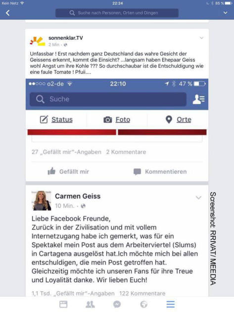 Der wütende Beitrag war ein Versehen und wurde zügig wieder von der Seite gelöscht. Gegenüber MEEDIA erklärte der Sender: „Der Post stammt von einem unserer Mitarbeiter, der über die Geschehnisse aufgebracht war und seine persönliche Meinung fälschlicherweise unter dem allgemeinen Sonnenklar.TV-Facebook-Account veröffentlicht hat. Wir haben dies schnell bemerkt und den Post innerhalb von wenigen Minuten von der Seite genommen. Die Meinung des einzelnen Mitarbeiters repräsentiert nicht die Haltung von Sonnenklar.TV. Von Seiten Sonnenklar.TV haben wir keine Anmerkungen zu den letzten Posts von Carmen Geiss.“