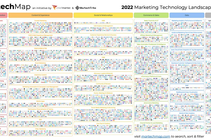 MarTech-Guru Scott Brinker hat jetzt zusammen mit Frans Riemersma von MartechTribe versucht, Ordnung in das Tool-Chaos zu bringen. Das Ergebnis ist eine völlig neue Supergrafik, die „Marketing Technology Landscape 2022“. Statt verstreuter Technologie-Inseln gibt es nun Struktur und eine Suchfunktion; statt Buchstaben-Bingo übersichtliche Kategorien und Filter. Eine durchaus gelungene Umsetzung, um den Marketing-Tech-Dschungel transparent zu machen.