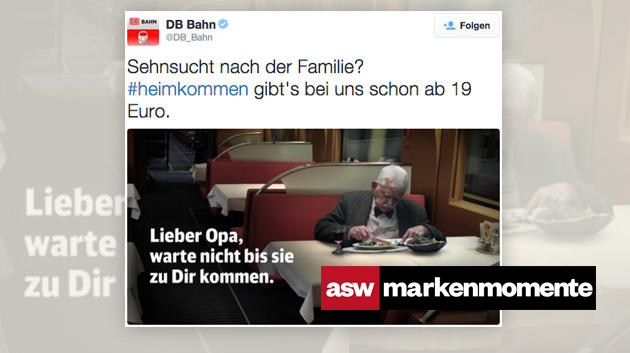 Alles in allem waren aber eher die tränenreichen Tweets über den Spot in der Mehrheit. Nicht so bei der Deutschen Bahn, die den Spot direkt für die eigene Sache aufgriff. „Sehnsucht nach der Familie. #heimkommen gibt es bei uns schon ab 19 Euro“, vermeldete der Konzern auf Twitter. Versehen mit einem Bild, auf dem der älterer (Edeka)-Herr ins Bordbistro montiert wurde. Gekonnt gekapert, lustige Aktion.