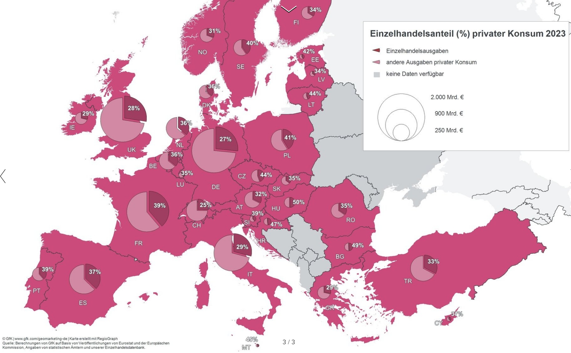 Die GfK (Gesellschaft für Konsumforschung) ist ein international tätiges Marktforschungsunternehmen mit Sitz in Nürnberg. Für das Jahr 2023 analysierte sie wieder umfassende Kennziffern zum europäischen Einzelhandel und zur Kaufkraft. Die Studie betrachtete zudem erstmals die Ängste und Anpassungsstrategien der Verbraucher*innen. Die Berechnungen der GfK zu Umsätzen und Kaufkraft erfolgten alle in Euro. Redaktionsschluss war Juni 2024.