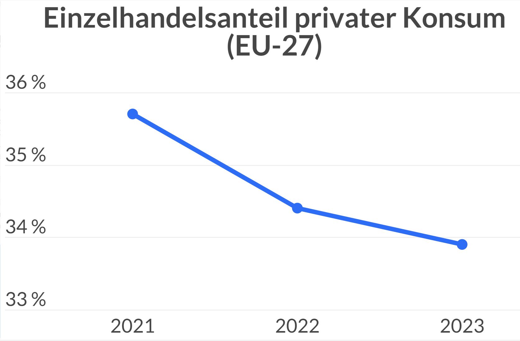 Nachdem der Einzelhandelsanteil an den privaten Konsumausgaben 2020 und 2021 pandemiebedingt angestiegen war, sank er in den letzten beiden Jahren wieder. 2023 gaben die EU-Bürger 0,5 Prozent weniger Geld im Einzelhandel aus als noch im Vorjahr, und das trotz eines Anstiegs der Kaufkraft und des Einzelhandelsumsatzes von jeweils 5,5 Prozent.