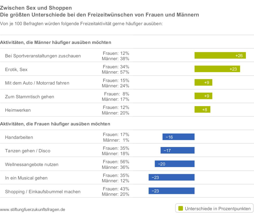 Zwischen den Geschlechtern zeigen sich hierbei sowohl Parallelen als auch Unterschiede. Frauen wie Männer würden gerne häufiger spontan sein, mehr Ausflüge machen und öfter einfach einmal ausschlafen. Deutlich größer ist der Wunsch bei Frauen, einen Einkaufsbummel zu unternehmen, tanzen zu gehen, Wellnessangebote zu nutzen, zu handarbeiten oder ein Musical zu besuchen. Männer würden sich dagegen gerne öfter handwerklich betätigen, zum Stammtisch gehen, mit dem Auto oder Motorrad unterwegs sein sowie häufiger Sex haben.