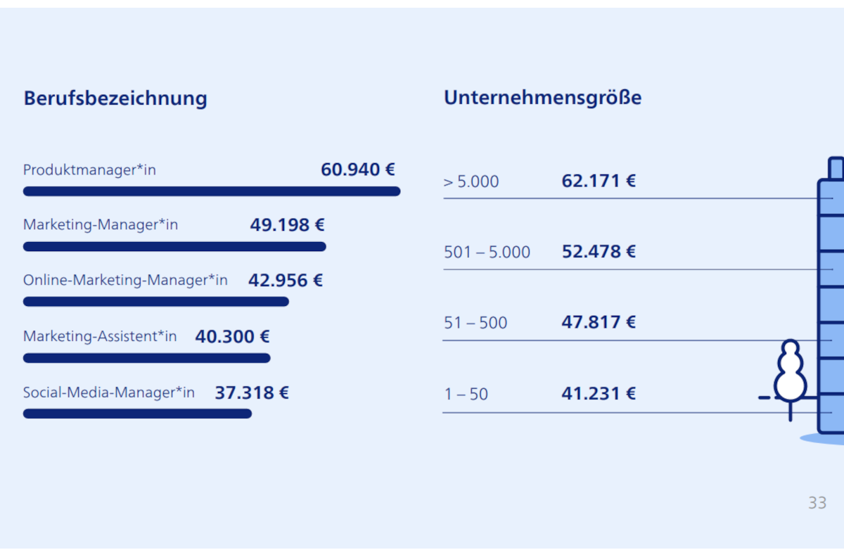 Das Bruttomediangehalt der Berufsgruppe Marketing und PR beträgt 49.249 Euro und ist entsprechend höher als im vorherigen Jahr. 2022 beträgt es 45.760 Euro. In Hessen verdient die Berufsgruppe dem Bruttomediangehalt zufolge mit 55.163 Euro am meisten. Danach folgen die Bundesländer Bayern und Hamburg.
