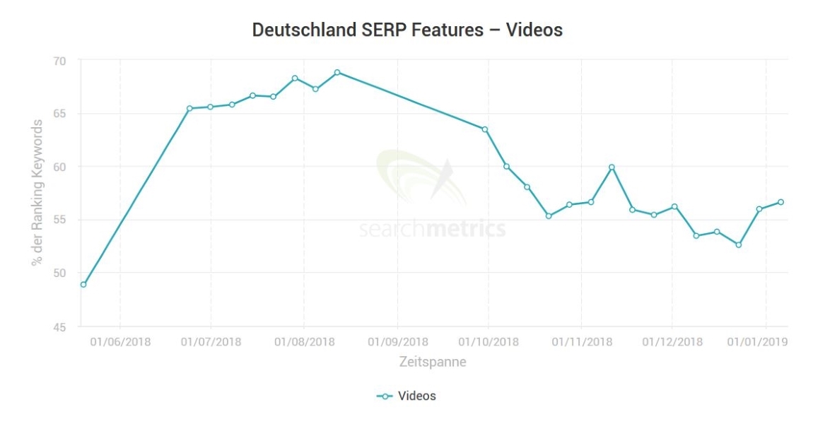 Google erweiterte im Zuge dieses Updates die Anzahl der Suchergebnisse, bei denen Videos integriert wurden. Waren vor dem Update Videos bei weniger als der Hälfte aller Suchergebnisse vorhanden, wurden bis Ende August schon rund 70 Prozent aller Suchanfragen mit mindestens einem Video beantwortet. Dies zeigen etwa die Searchmetrics-Daten der SERP Features: