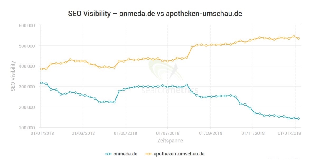 Beim Verlauf der SEO Visibility stellt sie apotheken-umschau.de als größter Gewinner und onmeda.de als größter Verlierer in der Health-Branche heraus. Lag der Unterschied zwischen beiden Domains vor dem Update noch bei rund 140.000 Visibility-Punkten, waren es zum Jahresende 2018 bereits 400.000 Punkte.
