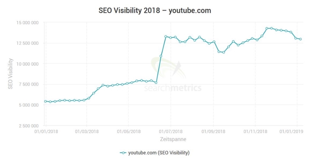 Es ist laut Searchmetrics vor allem einer Anpassung des Google-Algorithmus im Juni 2018 dafür verantwortlich, dass YouTube seine SEO Visibility um 143 Prozentpunkte steigern konnte. Von der Einbindung von Video-Karussellen auch in den Desktop-Suchergebnissen sowie einer steigenden Anzahl von Video-Ergebnissen konnte vor allem die Alphabet-Tochter YouTube profitieren: