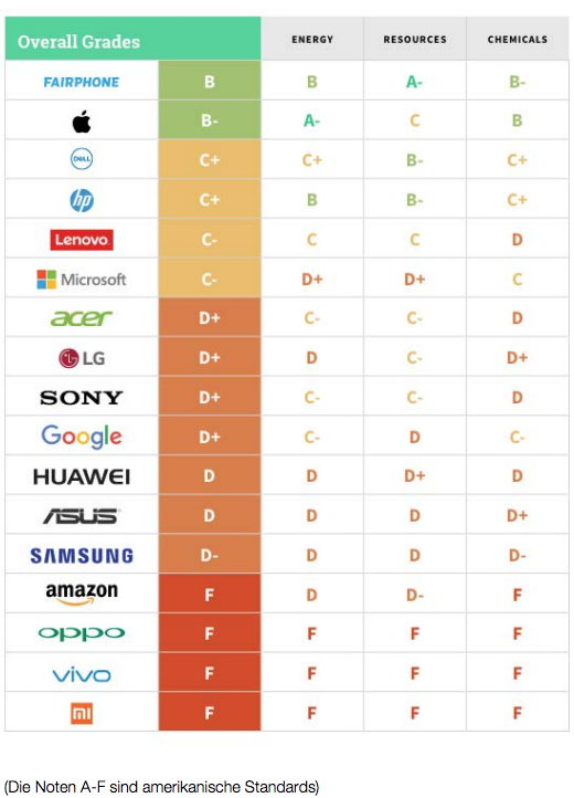 Als grünste Anbieter erwiesen sich das Fairphone (Rang 1) sowie Apple (Rang 2). Beide verzichten auf gefährliche Chemikalien und produzieren klimafreundlich. Als einziges Unternehmen habe zudem Apple zugesagt, nicht nur Datenzentren und Büros, sondern zukünftig die gesamte Lieferkette mit Erneuerbaren Energien zu versorgen. Dell und HP folgen auf den nächsten Plätzen, da sie reparier- und aufrüstbare Geräten anbieten. Schlecht schneiden Apple, aber auch Microsoft, bei der Reparierbarkeit ihrer Geräte ab. Auf Wegwerfhandys, die maximal zwei Jahre genutzt werden, setzen auch die chinesischen Firmen Huawei, Oppo und Xiaomi. Sie produzieren aktuell ein Viertel der weltweit verkauften Smartphones. Entgegen früherer Zusagen vieler Firmen verzichten nur Apple und Google konsequent auf umwelt- und gesundheitsschädliche Chemikalien wie PVC und bromierte Flammschutzmittel in ihren Produkten.