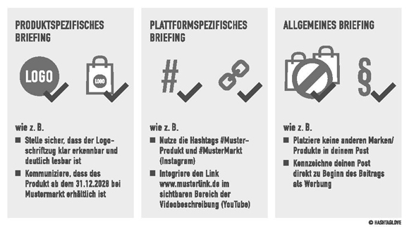 Anschließend geht es in die Feinarbeit. Ein umfassendes Influencer-Briefing lässt sichin drei Leistungs-Kategorien aufteilen: Produktspezifisches, Plattformspezifisches und Formelles Briefing.