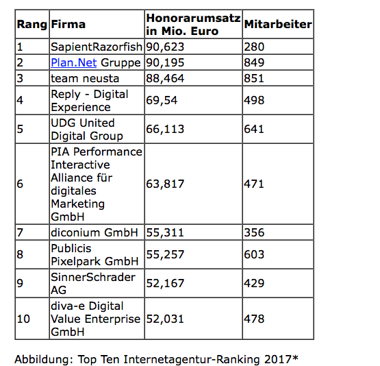 Den ersten Platz belegt die Agentur SapientRazorfish. Auf Platz zwei folgt Vorjahressieger Plan.net. Den dritten Rang verteidigt team neusta. Reply – Digital Experience macht einen Rang gut und steigt 2017 auf Platz 4 auf. Die UDG United Digital Group, die im vergangenen Jahr noch auf Rang 2 stand, verliert drei Plätze und rutscht auf Platz 5 ab. Neu in den Top 10 sind die Agenturen PIA Performance Interactive Alliance für digitales Marketing (6) und diconium (7). Wieder unter den zehn größten Full-Service-Digitalagenturen im Umsatzranking befinden sich auch Publicis Pixelpark (8), SinnerSchrader (9) und diva-e Digital Value Enterprise auf Platz 10.