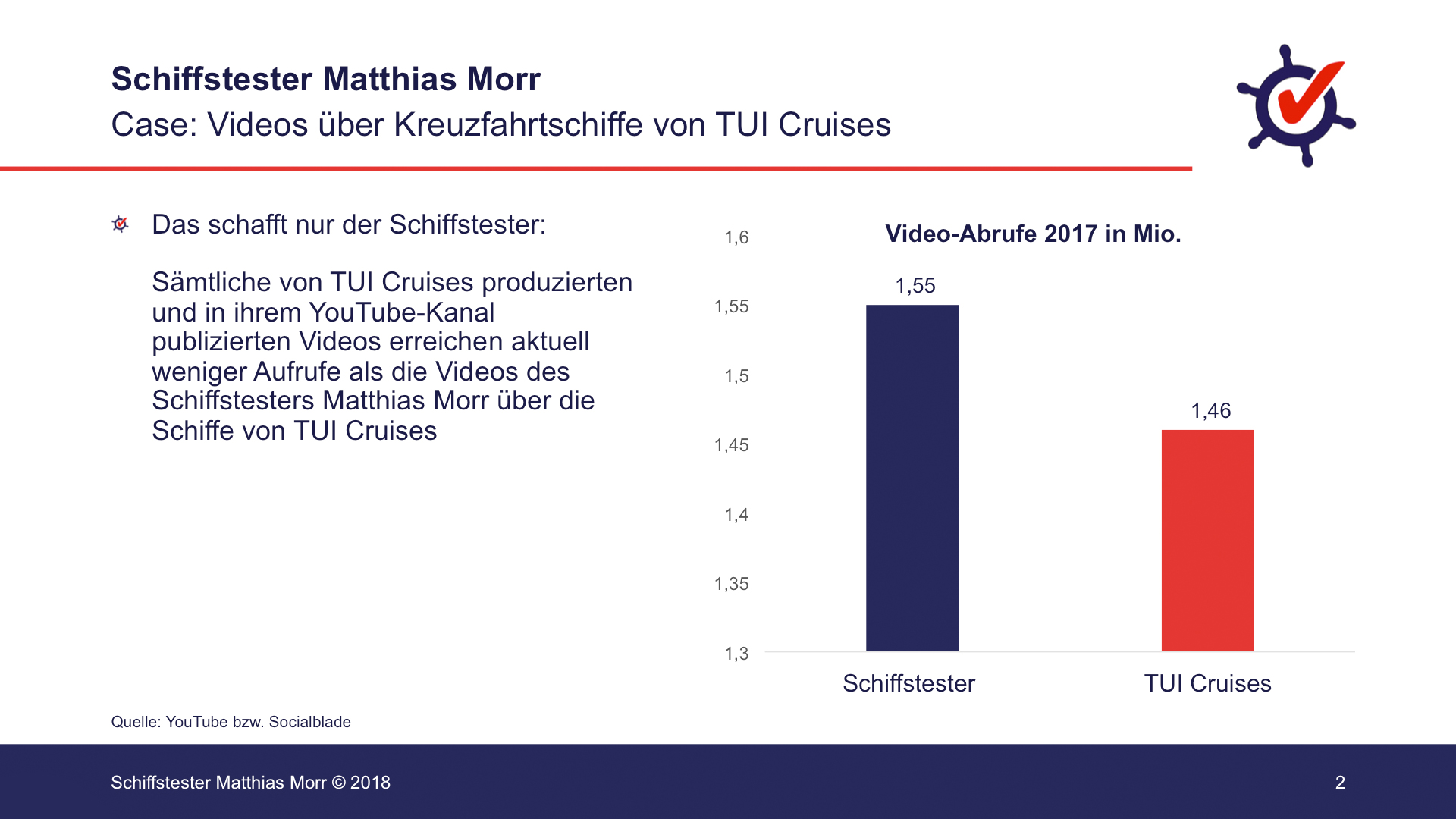 Er nennt sich Schiffstester und erreicht mit seinen Videos monatlich 150.000 Kreuzfahrt-Interessierte YouTube-Nutzer. Jede Woche lädt Matthias Morr zwei neue Videos über Kreuzfahrtschiffe und -reisen sowie Landausflüge auf dieser Plattform hoch. Alle Videos zusammen werden monatlich im Schnitt über 500.000 Mal aufgerufen. Hinzukommen 26.000 Facebook-Fans, die Morrs Statements liken, kommentieren und sharen.