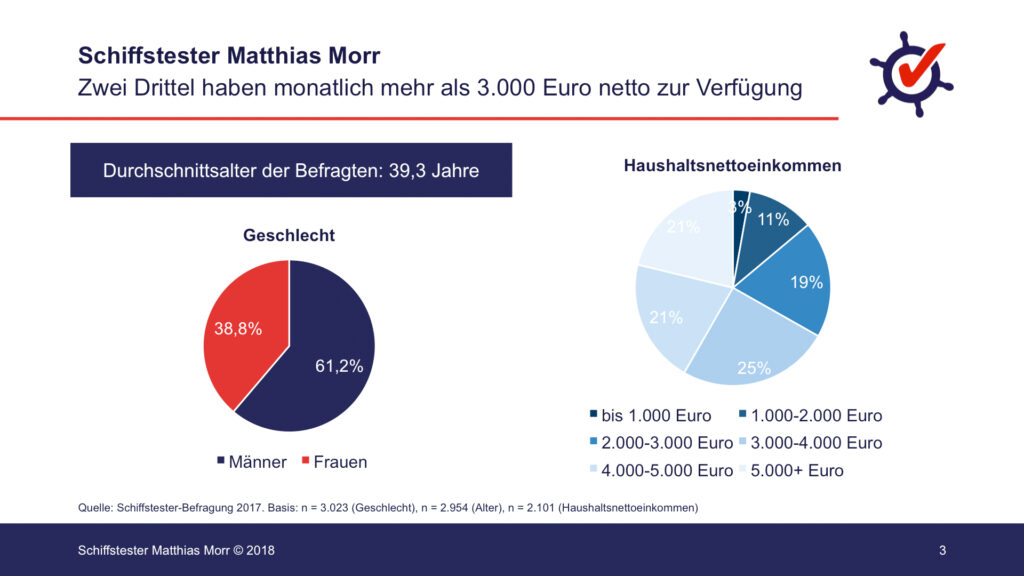 Die Follower des Schiffstesters entsprechen dabei weder dem Klischee der sehr jungen Onliner, noch der grauhaarigen Kreuzfahrgäste. Vielmehr verbindet er alle, die eine Affinität zum Thema haben, sei es als Vorbereitung für die erste Reise dieser Art oder für erfahrene Kreuzfahrer. Das belegen YouTube-Auswertungen sowie eine Online-Befragung von über 3.000 Followern, die im vergangenen Jahr von Dr. Peters Media Consulting vorgenommen wurde.