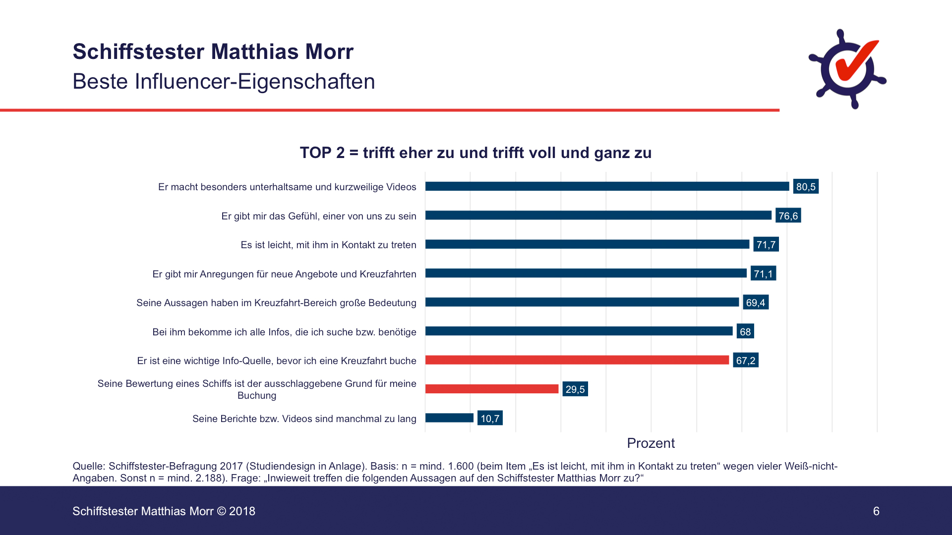 Im Fokus der Untersuchung stand dabei die Frage, ob Morr auch einen relevanten Einfluss auf die Kreuzfahrtbuchungen hat. Dies ist der Auswertungen zufolge der Fall: Für 67 Prozent der Befragten ist er eine wichtige Info-Quelle, bevor sie eine Reise buchen. Für fast jeden dritten Nutzer (30 Prozent) sei seine Einschätzung der entscheidende Grund für eine Buchung.