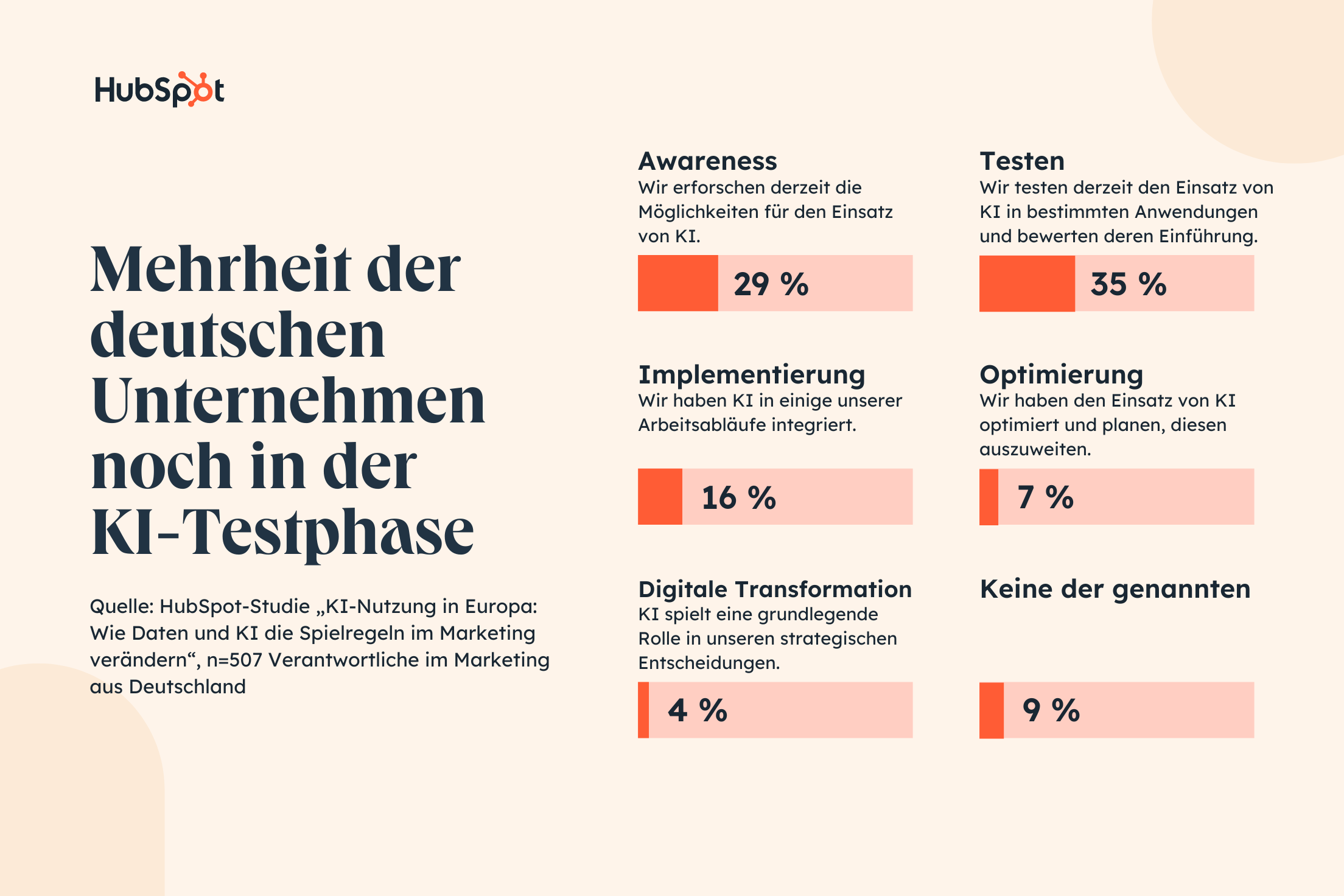 Der Einsatz von Künstlicher Intelligenz (KI) im Marketing steckt bei vielen kleinen und mittelständischen Unternehmen in Deutschland noch in den Anfängen. Laut einer aktuellen Studie des Plattformanbieters Hubspot und des beruflichen Netzwerks LinkedIn haben lediglich sieben Prozent der Marketingfachleute in Deutschland den Einsatz von KI bereits optimiert und planen, diese verstärkt einzusetzen.