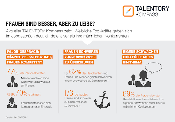 „Unsere Umfrage zeigt: Hoch qualifizierte Kandidatinnen sind in vielen Fällen fachlich deutlich besser aufgestellt als viele Männer. Trotzdem gelingt es ihnen offenbar noch nicht, dieses Knowhow auch in ein selbstbewusstes Auftreten zu übertragen. Arbeitgeber, die mehr Frauen in Top-Positionen bringen möchten, sind also auf gute Personalberater angewiesen, denen es gelingt auch gehemmte Kandidatinnen als geeignete Top-Managerinnen zu erkennen und entsprechend zu empfehlen“, erklärt Ronald de Louwere, Geschäftsführer bei TALENTORY in Zürich.