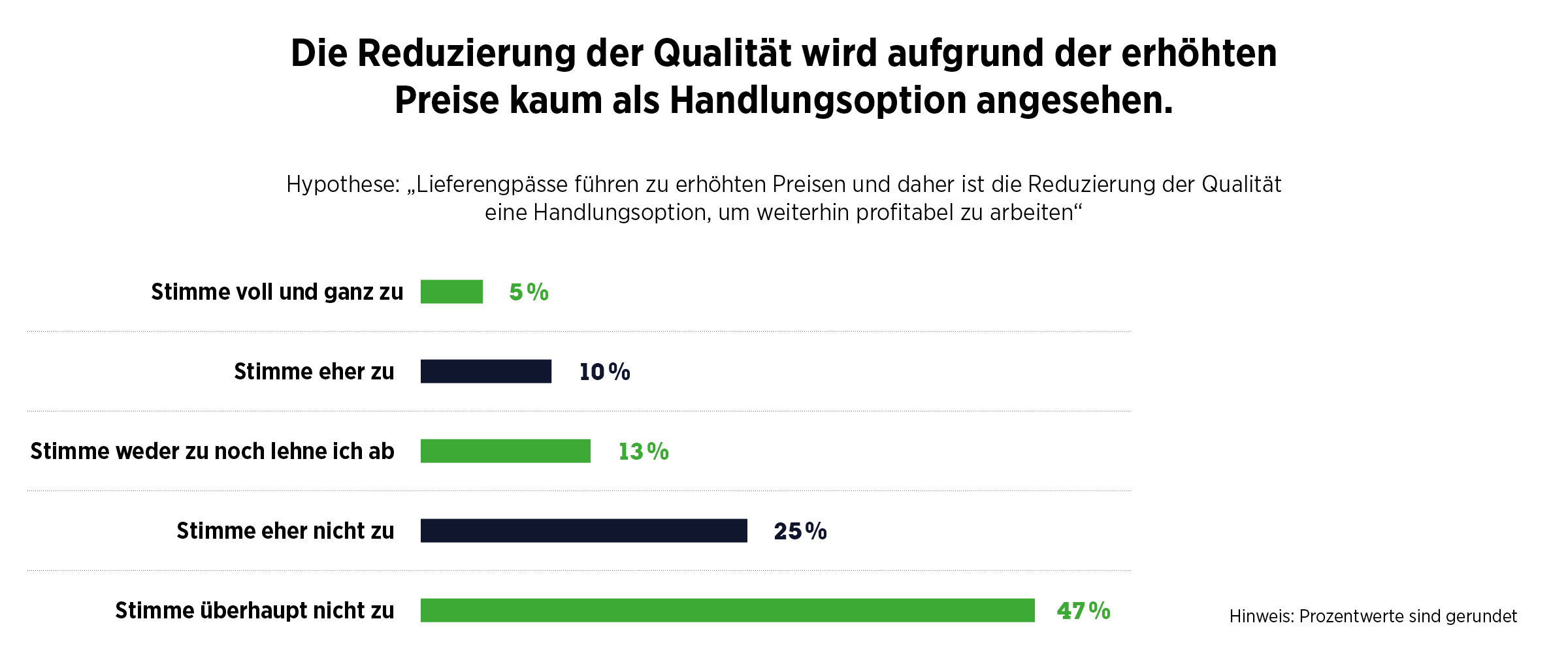 Die Lage ist verzwickt. Unternehmen können Preiserhöhungen einerseits umgehen, indem sie die Qualität ihrer Produkte senken. Das wäre der kund*innenunfreundliche Ansatz. Glücklicherweise erachten nur 15 Prozent der befragten Marketer*innen eine geminderte Qualität als eine wirkliche Handlungsoption, um weiterhin profitabel arbeiten zu können. Das Gros (72 Prozent) lehnt entsprechende Maßnahmen strikt ab. Diese Mehrheit der Marketer*innen will die eigenen Standards aufrechterhalten, auch wenn Lieferengpässe für erhöhte Preise sorgen.