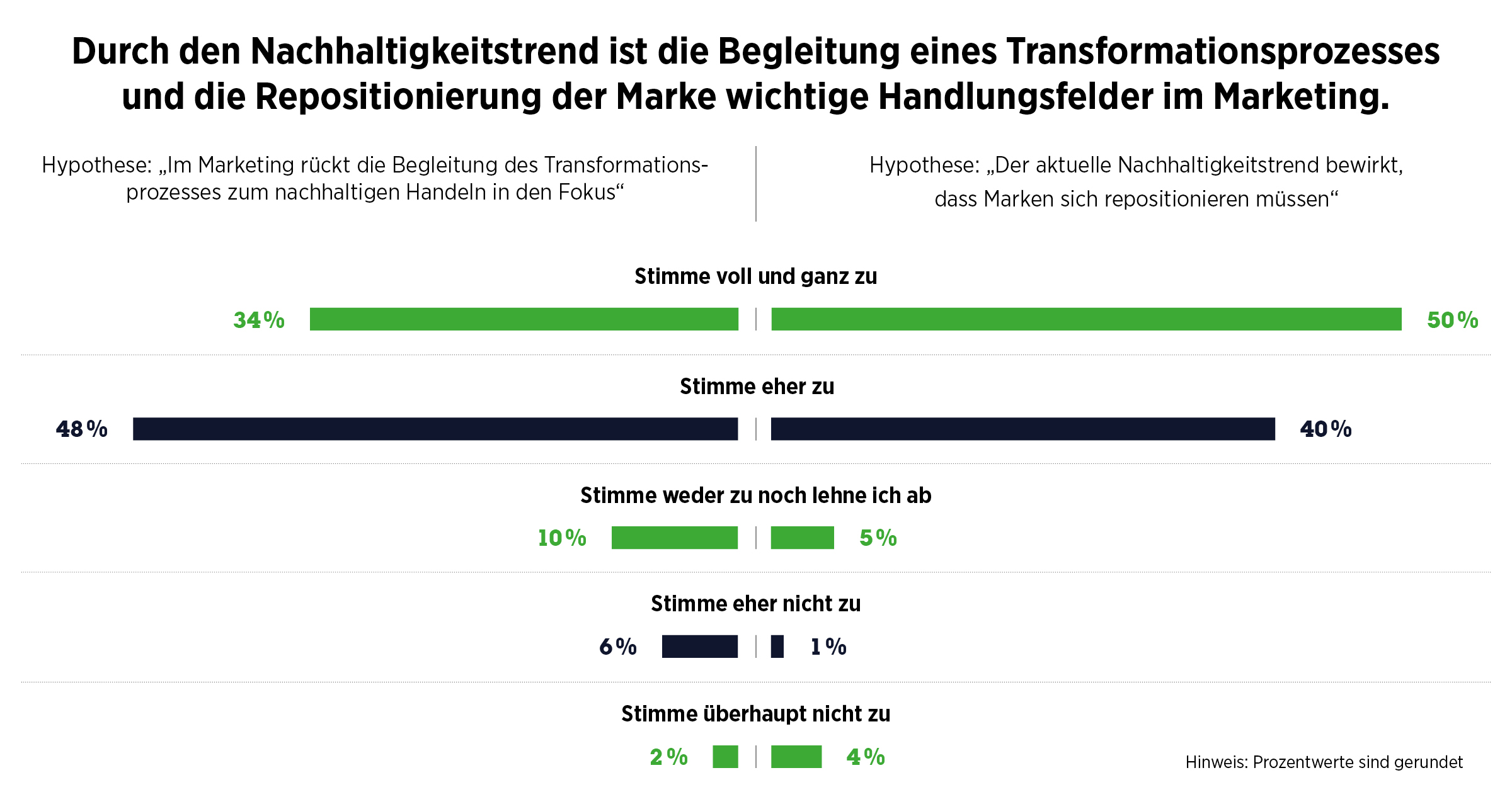 Die Transformation zum nachhaltigen Handeln muss vor allem eines: ganzheitlich gedacht werden. Viele Marken müssen sich repositionieren. 90 Prozent der Befragten betrachten das als logische Folge des aktuellen Nachhaltigkeitstrends. Damit begegnet das Marketing nicht nur den Zwängen des Klimawandels, sondern kommt auch den Forderungen und Erwartungen der Konsument*innen nach.