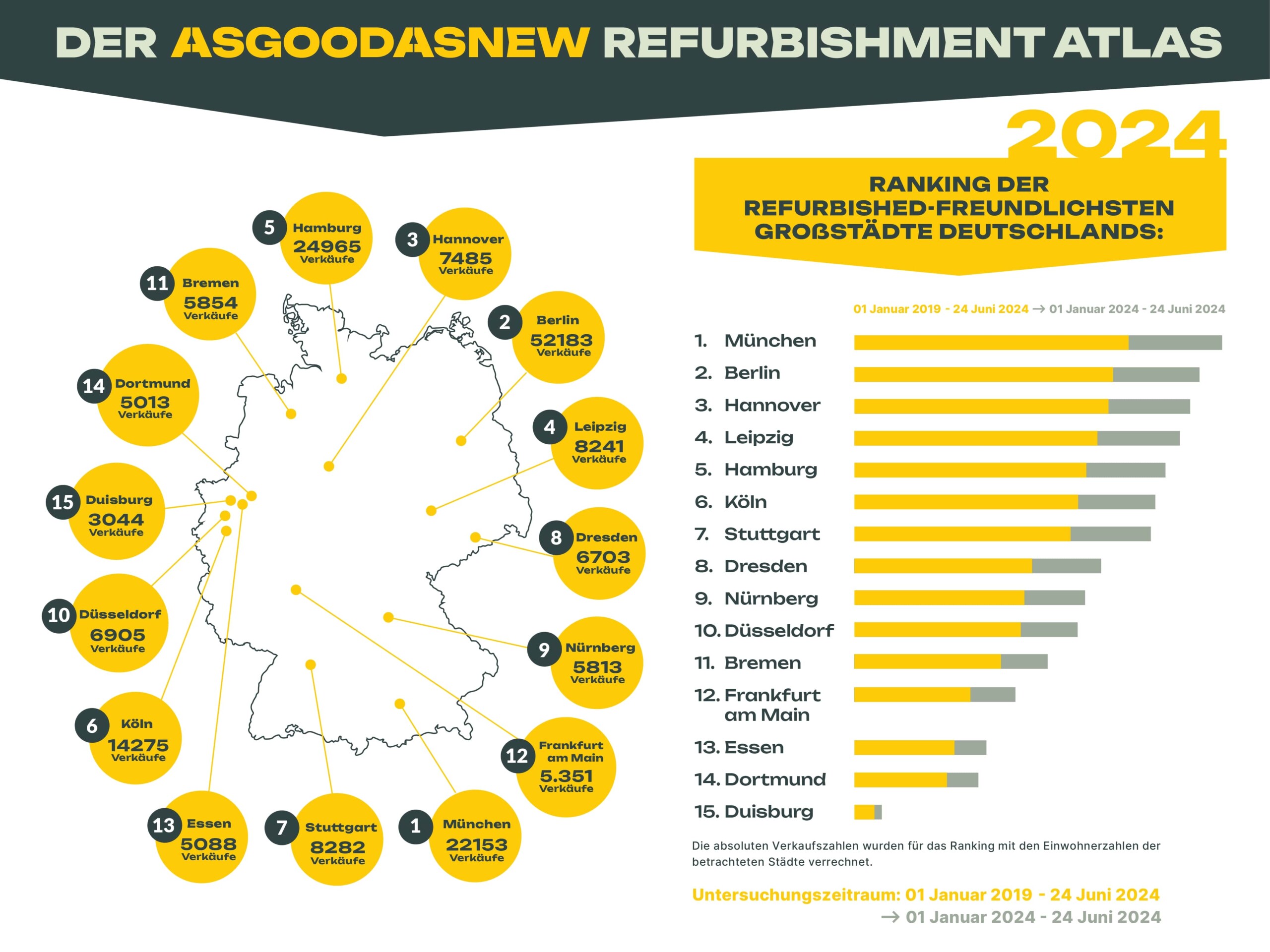 Der erste Refurbishment Atlas vom August 2023, zeichnete ein ähnliches Bild: München, Berlin und Hannover führten ebenfalls das Ranking an. Die neuen Zahlen zeigen jedoch, dass München bald seine Spitzenposition verlieren könnte. Schaut man nur auf die Verkäufe im Jahr 2024, führt Leipzig die Auswertung an. München liegt hier nur noch auf Platz zwei. Bleibt dieser Trend weiterhin bestehen, könnte die sächsische Stadt bald die refurbish-freundlichste Stadt Deutschlands werden.
