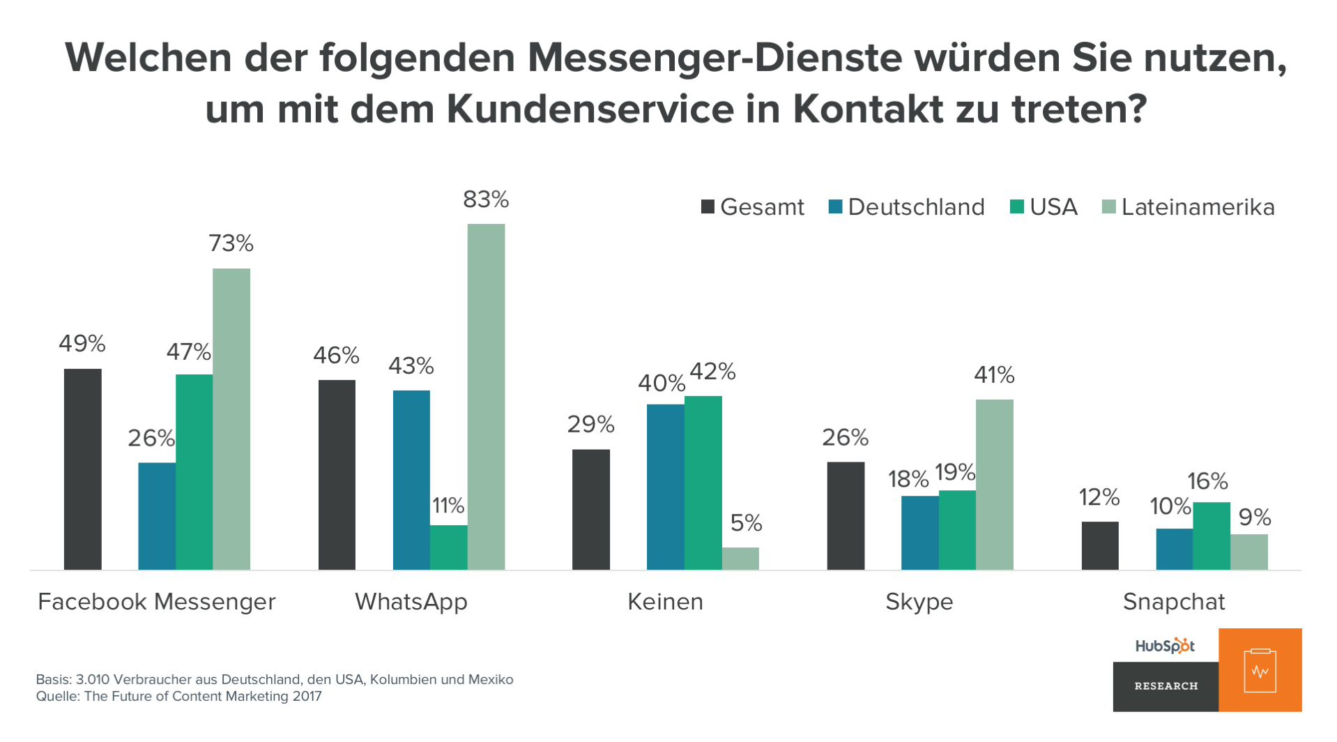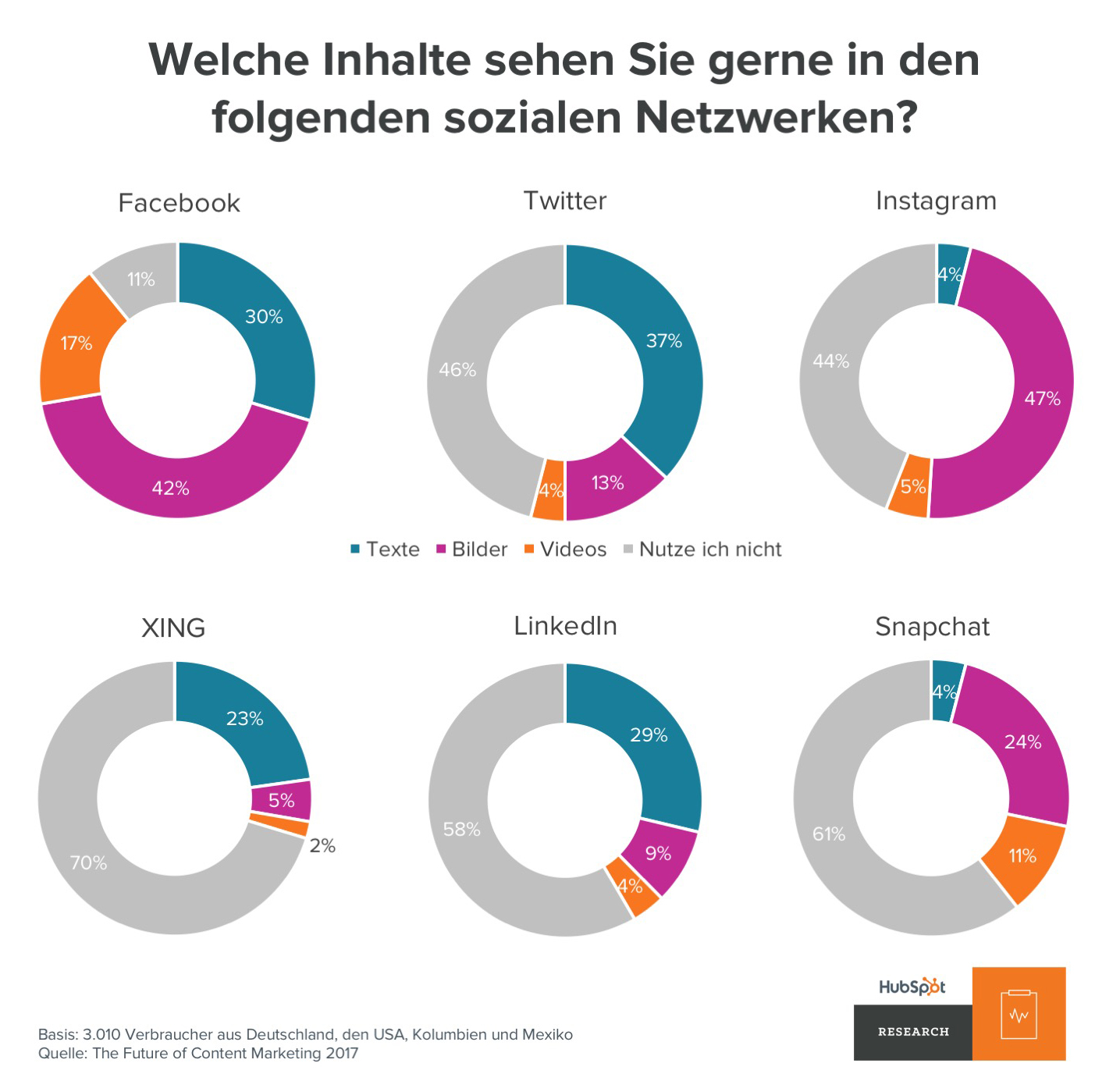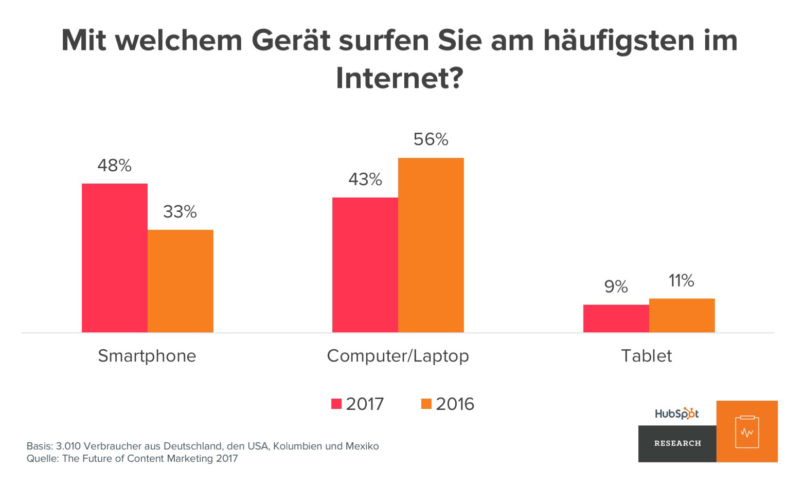 * Für die 2017er Ausgabe der Studie „The Future of Content Marketing“ hat HubSpot 3.010 Verbraucher zu je einem Drittel aus Deutschland, den USA und Lateinamerika (Kolumbien und Mexiko) zu ihren Online-Gewohnheiten befragt. Es gab ein ausgewogenes Verhältnis, was die Geschlechter und die Verteilung auf die Altersgruppen von 18 bis Ü55 Jahren betraf. Die vollständige Studie finden Sie hier.