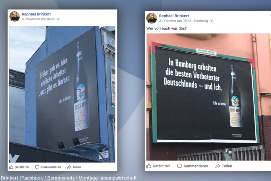 “Und ich” arbeitet in diesem Fall bei Pilot. Denn die Hamburger Agentur ist für die Texte und die Platzierung der Plakate zuständig. Über die Orte, an denen die Werbebotschaften aufgehängt wurden, ärgerte sich beispielsweise Brinkert besonders. So ließen die Macher eines der Poster in Hamburg Ottensen bzw. Altona kleben.
