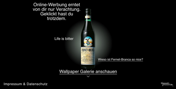 Denn auch für seine Konsumenten hat der Schnaps stets einen bitteren Beigeschmack in seiner Ansprache. So heißt es wenig freundlich direkt auf der Startseite der Markenseite von Fernet Branca: “Online-Werbung erntet von dir nur Verachtung. Geklickt hast Du trotzdem”.