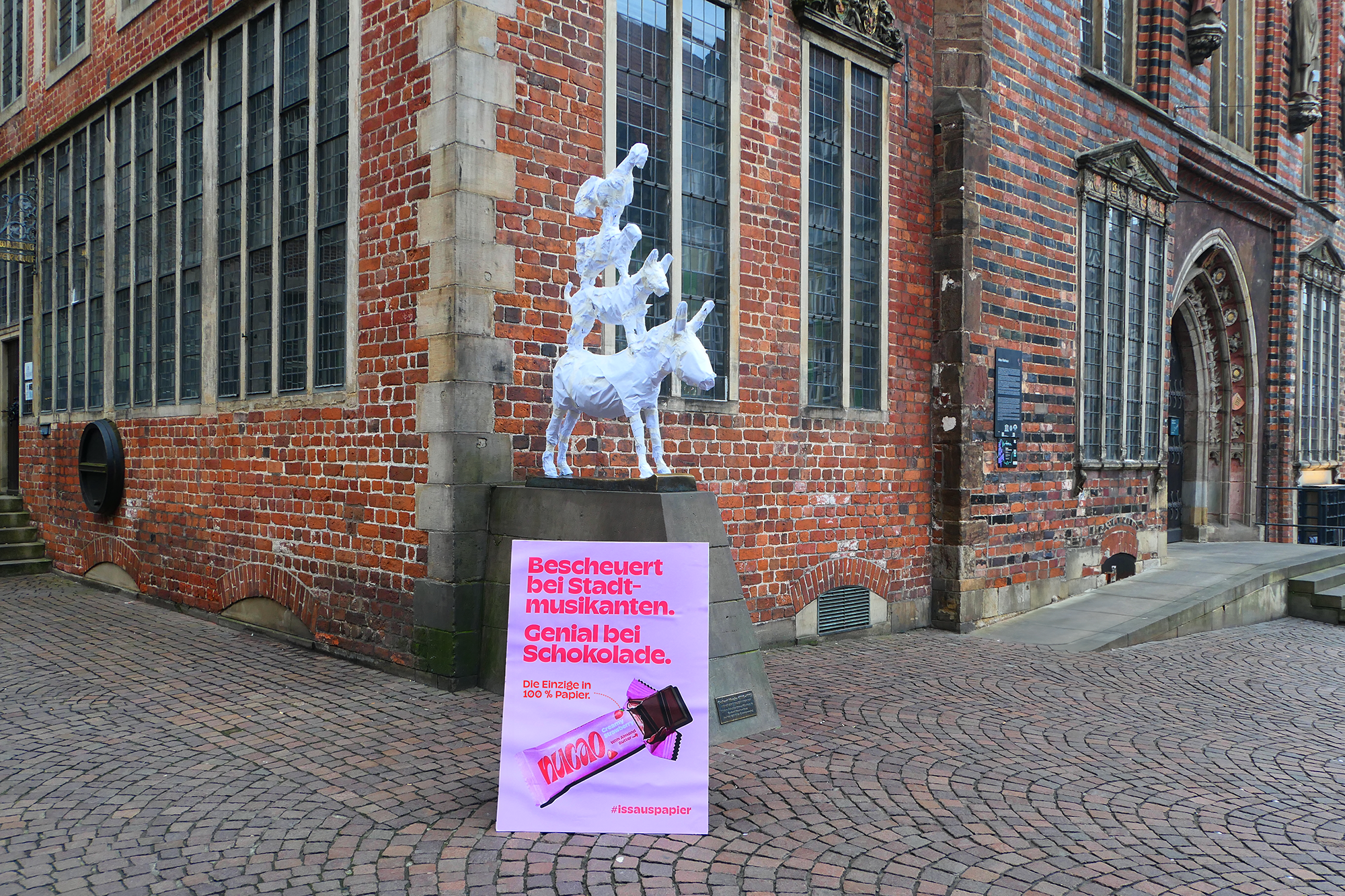Nicht aus-, sondern angezogen – und zwar in Papier –, hatte das Start-up bereits im Frühjahr im Rahmen einer anderen OOH-Kampagne verschiedene touristische Wahrzeichen wie den Berliner Bären oder die Bremer Stadtmusikanten sowie Alltagsgegenstände wie Schaukeln auf Spielplätzen. Der Claim dazu (im Falle von Bremen): „Bescheuert bei den Stadtmusikanten. Genial bei Schokolade.“