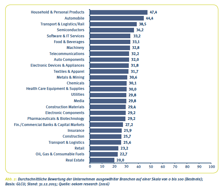 In dem Oekom-Bewertungssystem gibt es maximal 100 Punkte für einen fairen Umgang etwa mit Lieferanten, Mitarbeitern, Transparenz oder Umwelt. Von den untersuchten Branchen schafft es keine auf einen Durchschnittswert von mehr als 50 Punkten. Am besten schneiden da noch Hersteller von Haushalts- und Pflegeprodukten mit 47,4 Punkten ab, an zweiter Stelle folgen immerhin Automobilhersteller (44,4 Punkte), an dritter Stelle Unternehmen aus der Branche Transport & Logistik/Rail (38,5 Punkte).