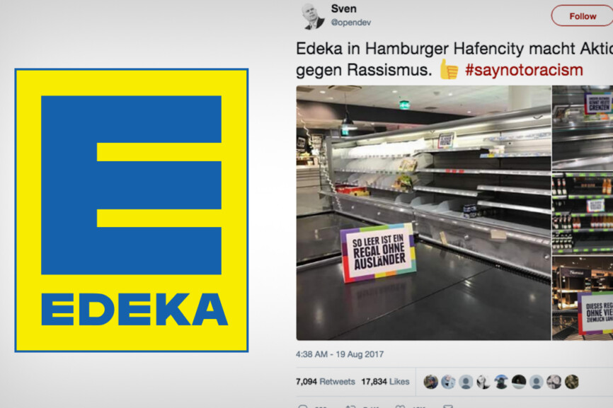 Weitere Schilder zeigten Sätze wie: „Dieses Regal zeigt: Deutschland wäre ärmer ohne Vielfalt“. Eine Fotostrecke zu der Aktion ging prompt Online und wurde ziemlich schnell von Huffington Post bis Bento geteilt. Einige Edeka-Kunde veröffentlichten verschiedene Fotos aus der Filiale. Eines bleibt bisher aber noch aus: Eine Stellungnahme oder Reaktion von Edeka selbst. Am Sonntag war der Filialleiter laut Huffington Post nicht erreichbar.Ging es der Supermarktkette um den „Tag der Vielfalt“ oder steckt dahinter eine Kunstaktion? Bisher alles noch unklar.