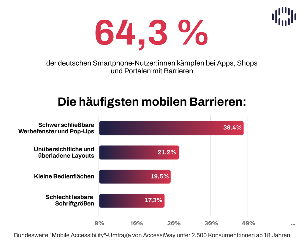 Die häufigsten mobilen Barrieren sind schwer schließbare Werbefenster und Pop-ups (39,4 Prozent), unübersichtliche und überladene Layouts (21,2 Prozent) sowie zu kleine Bedienflächen (19,5 Prozent) und schlecht lesbare Schriftgrößen (17,3 Prozent).
