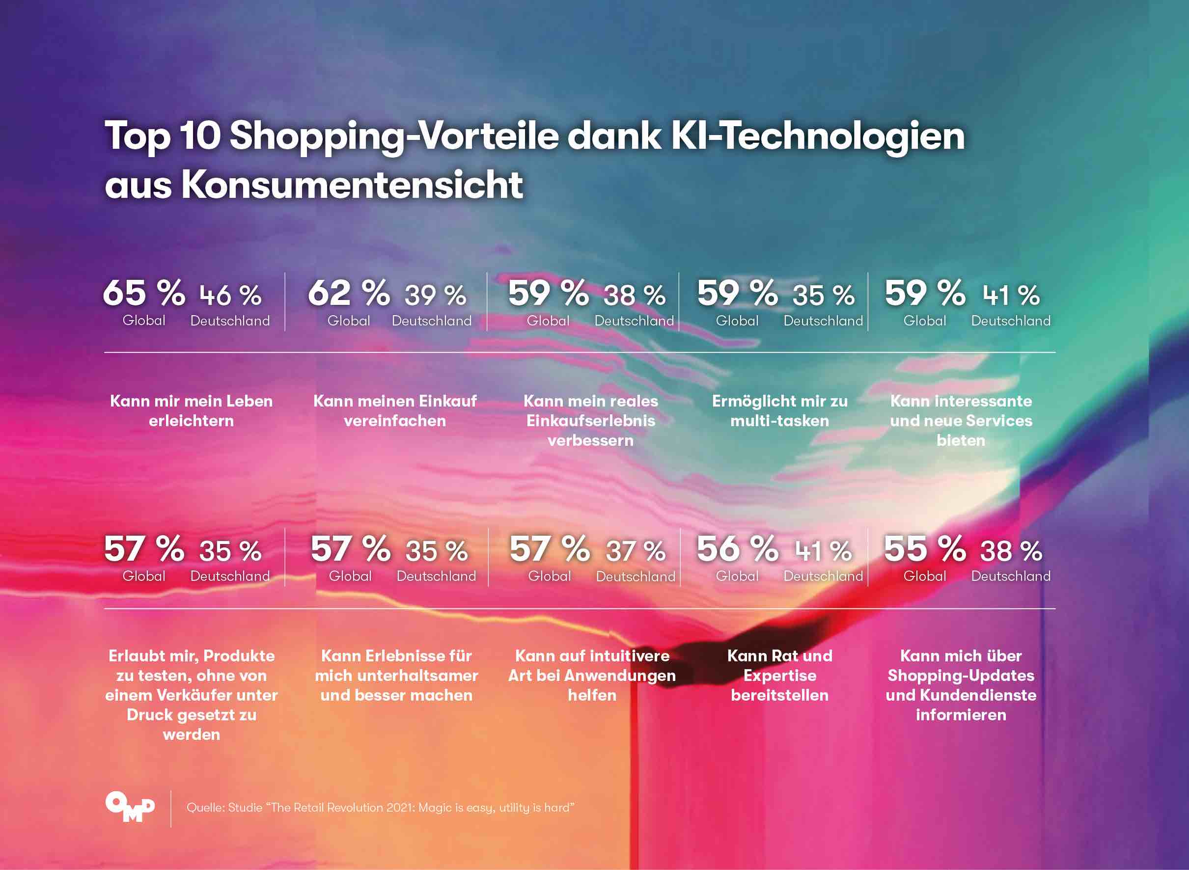 Die für die Befragten attraktivsten KI-Interaktionen sind diejenigen, die das Leben einfacher machen, Einkäufe bequemer oder Erlebnisse im realen Leben verbessern. 55 Prozent der Befragten (36 Prozent in Deutschland) sind der Meinung, dass Technologie Bezahlvorgänge vereinfacht und den Einkaufsprozess schneller gemacht hat. Die Menschen wünschen sich von smarten Technologien vor allem mehr Gesundheits- und Sicherheits-Features, sowie mehr Produktbewertungen und Empfehlungen direkt vor Ort im Geschäft.
