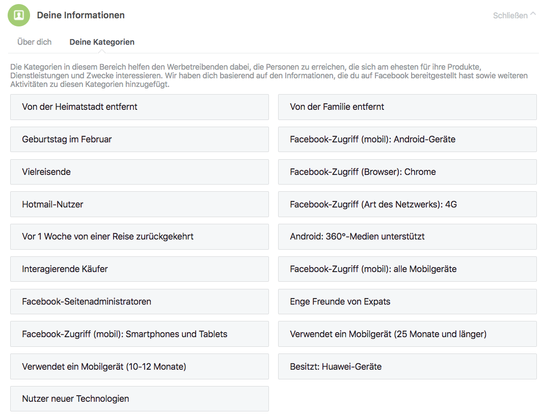 Und Facebook setzt noch einen oben drauf und beschreibt, wer man ist: „Die Kategorien in diesem Bereich helfen den Werbetreibenden dabei, die Personen zu erreichen, die sich am ehesten für ihre Produkte, Dienstleistungen und Zwecke interessieren. Wir haben dich basierend auf den Informationen, die du auf Facebook bereitgestellt hast sowie weiteren Aktivitäten zu diesen Kategorien hinzugefügt“, schreibt Facebook.