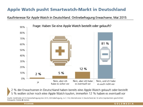 Würden zu den aktuellen Käufern allein die Interessenten hinzukommen, die zum Kauf fest entschlossen sind, könnte Apple in Deutschland rund 3,4 Mio. Exemplare ihrer Computeruhr absetzen. Bei einem Einstiegspreis von 399,00 Euro brächte dies einen Umsatz von mindestens 1,4 Mrd. Euro. Diese positiven Aussichten dürften Apple darüber hinwegtrösten, dass 81 Prozent der Befragten derzeit kein Interesse haben, sich eine Apple Watch anzuschaffen.