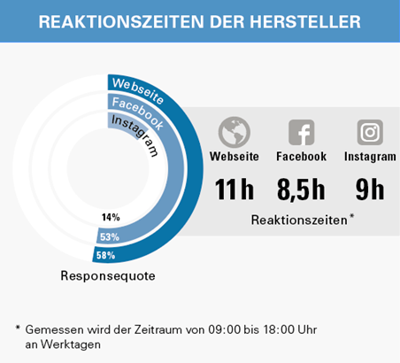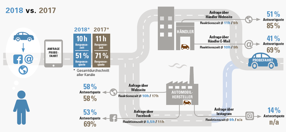 Im Rahmen der Studie wurden Hersteller und Händler differenziert ausgewertet und die Ergebnisse mit denen des Vorjahres verglichen. Hier zeigt sich: Die Antwortrate der Hersteller über die Website stagniert bei lediglich 58%. Bei Facebook sank sie sogar um 16% auf nur noch knapp die Hälfte (53%). Insofern die Hersteller aber antworten, sind sie deutlich schneller geworden. Wer eine Probefahrt über die Website anfragt, wartet durchschnittlich sieben Stunden kürzer auf eine Rückmeldung als noch 2017. Über Facebook geht es immerhin 1,5 Stunden schneller. Ein positiver Trend – auch wenn das Optimum noch lange nicht erreicht ist.