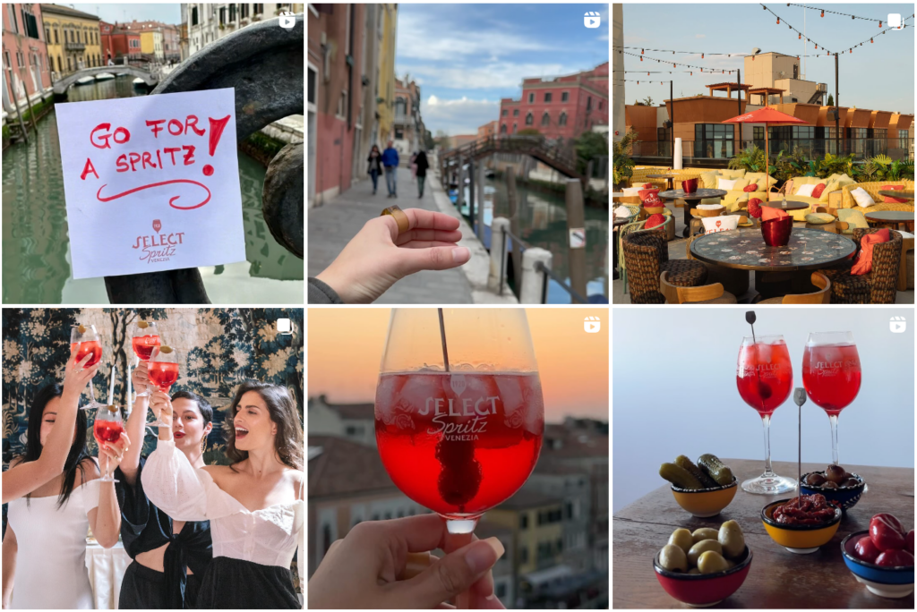 Die Aperitif-Marke erreicht auf Instagram über 13.000 Follower*innen. Auf dem Account findet man unter anderem Zubereitungs- und Anrichtungstipps. Die Videos und Fotos zeigen Personen, die Select Aperitivo in Vendig bei Sommeruntergang trinken und machen Lust auf Urlaub in Italien. Der Fokus des Contents liegt deutlich auf der Herkunftsstadt Venedig. Die Webseite der Marke zeigt neben Rezepten und Kaufmöglichkeiten auch Informationen zu Veranstaltungen, wie beispielsweise die Select Spritz Week, die zuletzt im Mai 2023 stattfand. In ausgewählten Bars kann man diesen Aperitif auch in Deutschland trinken.