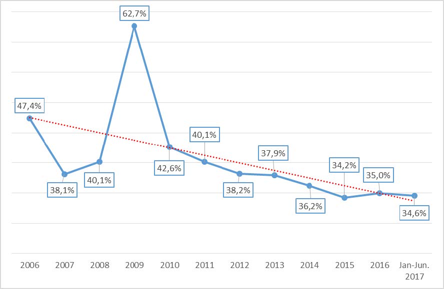 Abb. 2 zeigt eine interessante Entwicklung. Der Anteil der Privatkunden bei den Neuwagenzulassungen geht systematisch zurück. Die rote Gerade zeigt die Trend-kurve. Im ersten Halbjahr 2017 wurden gerade mal 34,6 Prozent aller neuen Pkw auf Privatkunden angemeldet: ein Negativrekord.